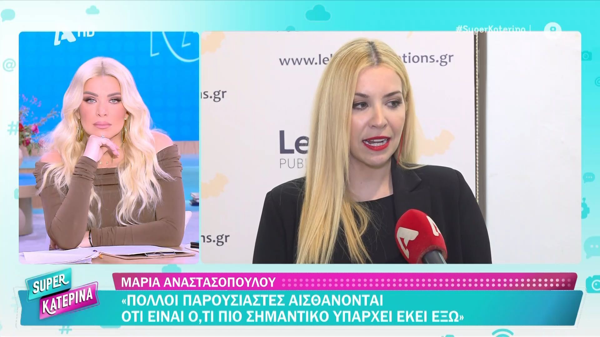Η Μαρία Αναστασοπούλου μίλησε για τη συνεργασία της με τον Άρη Πορτοσάλτε, το νέο βιβλίο του Γιώργου Λεμπέση, την εκπομπή του Κώστα Τσουρού και εξέφρασε την άποψή της για το τηλεοπτικό τοπίο.